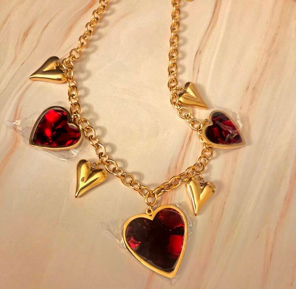 Statement bedel ketting met bordeaux rode hartjes.